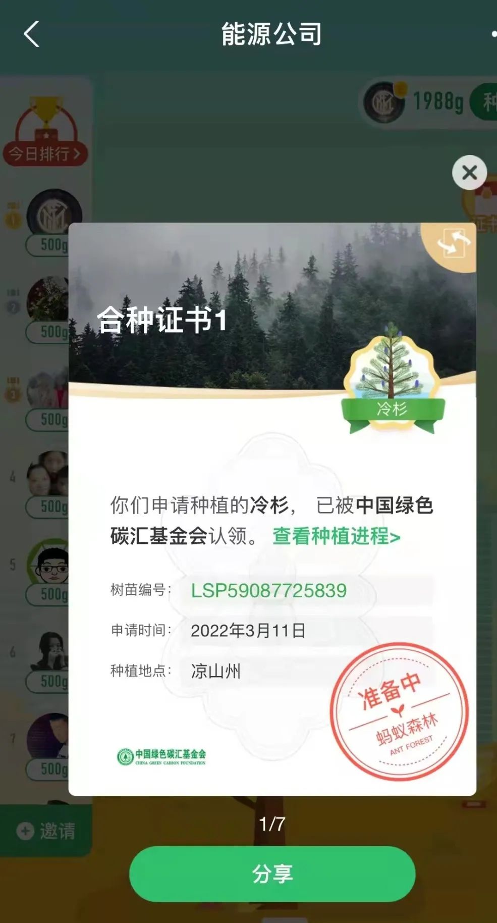 “一花一草皆生命,一枝一叶总关情。”早在2019年起,公司就通过支付宝蚂蚁森林组建了一只“金年会app手机版在线登录云种树小队”,如今队伍人数越来越壮大,已有59位队员,截止目前,在酒泉、大理、邯郸等地,种下了冷杉、侧柏、云杉、胡杨等7棵大树。3月11日,在小伙伴的共同努力下,我们又种下了一棵冷杉树,该树被中国绿色碳汇基金会认领,将种植到凉山州地区。